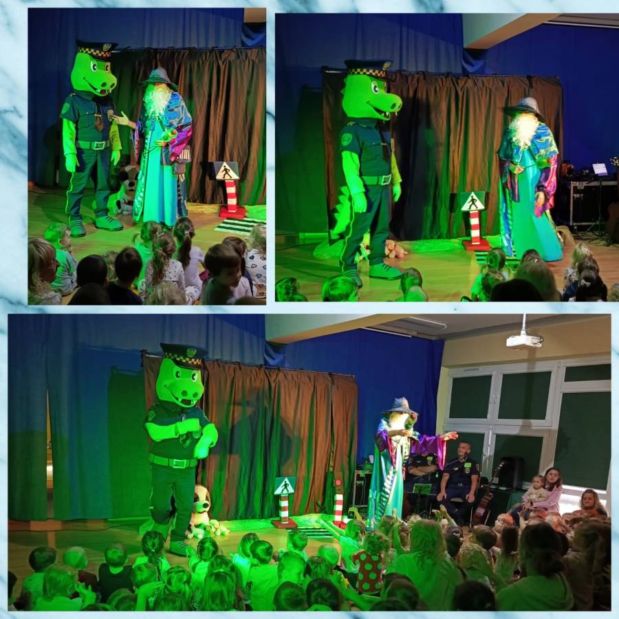 Dnia 02.10.2025 r. w przedszkolu zagościli Strażnicy Miejscy, którzy zaprezentowali dzieciom spektakl pt. Kraina Zakręconego Czasu, czyli bajka o mądrych dzieciach. Spektakl opowiada historię Adasia, który z pomocą Czarodzieja, Smoka Barbakusa i Strażników poznaje prawidłowe sposoby zachowania w sytuacjach, w których może znaleźć się każdy z młodych widzów. Dzięki przygodom Adasia- przedszkolaki utrwaliły zasady bezpiecznego przechodzenia przez jezdnię, przećwiczyły pozycję żółwia w razie ataku psa oraz jak zachować się, gdy zaczepi ich nieznajomy. Była to wspaniała edukacja poprzez wrażenia artystyczne oraz muzyczne. Bardzo dziękujemy Strażnikom Miejskim za wizytę!