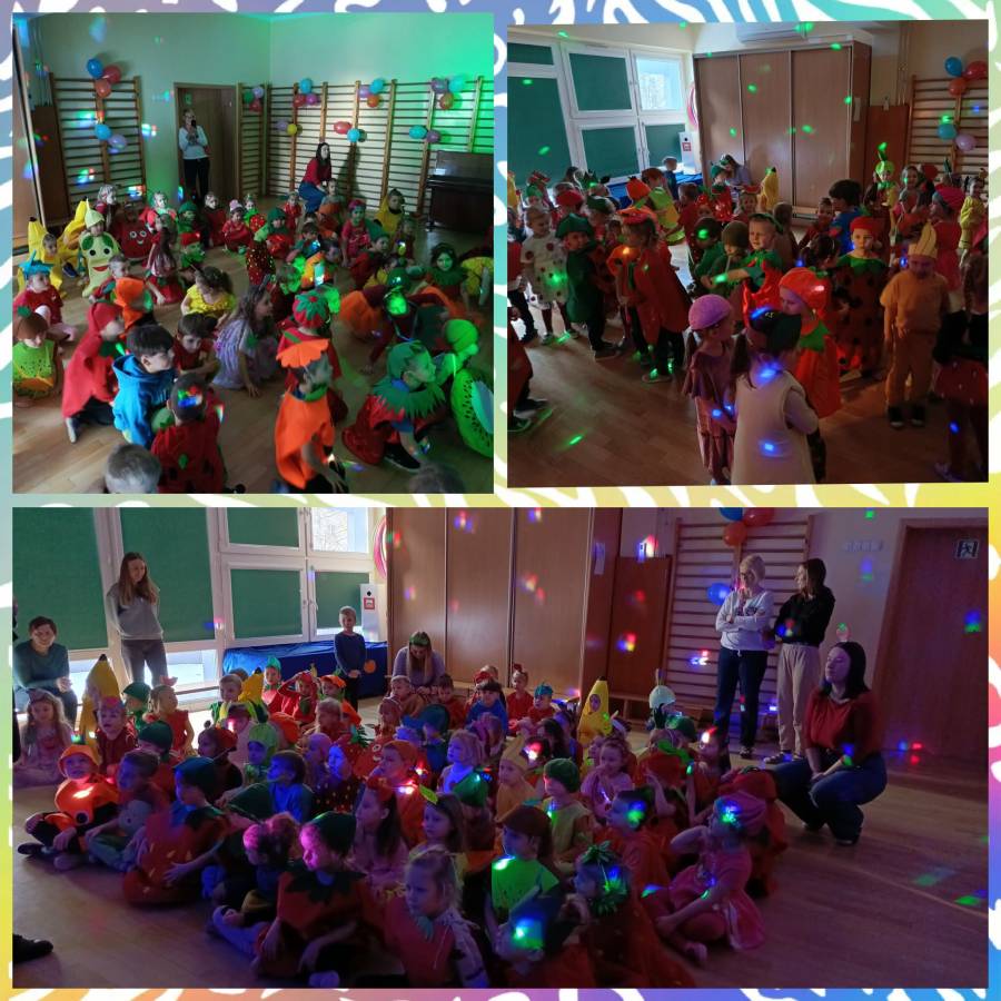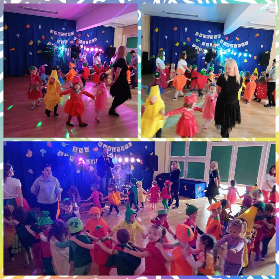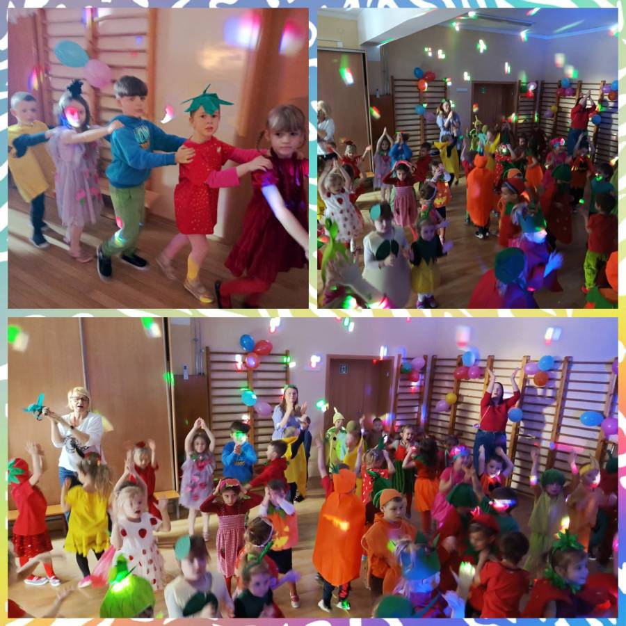 Jak co roku w karnawale, dnia 19 stycznia 2026 r. w przedszkolu odbył się oczekiwany przez dzieci bal- w tym roku owocowo- warzywny. Przedszkolna sala zamieniła się w kolorowy ogród pełen tańczących owoców i warzyw. Na parkiecie pojawiły się między innymi Kiwi, Marchewki, Banany i Truskawki. Nie sposób zliczyć i wymienić tych wszystkich postaci. Rozpoznać dzieci było bardzo trudno.